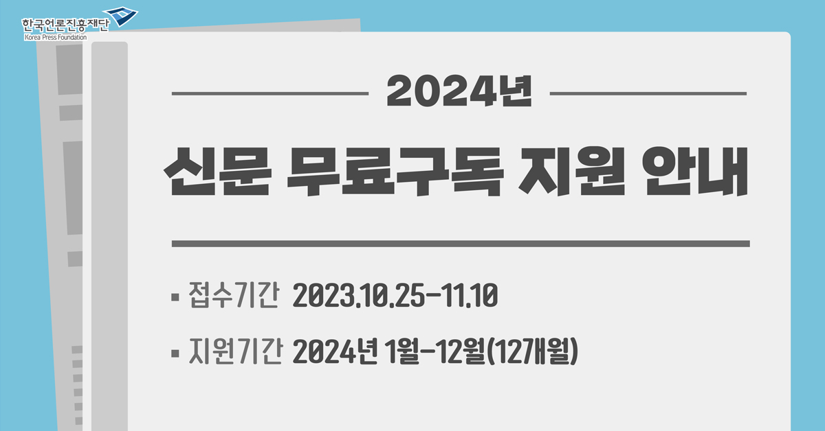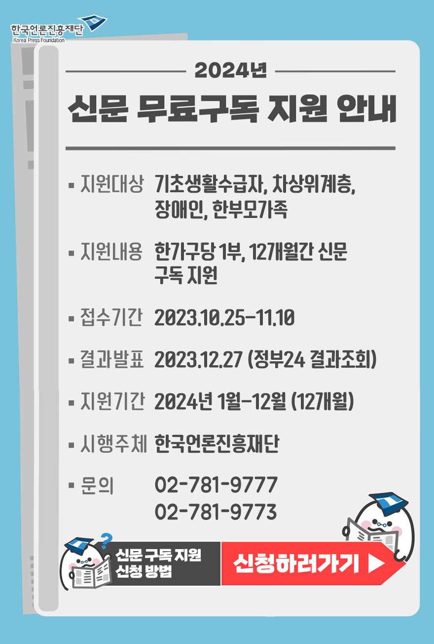 ◎ 사업개요ㅇ (지원내용) 신문 무료구독 지원ㅇ (신청대상) 기초생활수급자, 차상위계층, 장애인ㅇ (신청기간) 2024. 11. 15 ~ 11. 28ㅇ (신청방법) 정부 24(www.gov).kr) 접속 → ‘신문구독지원’ 서비스 검색 → ‘무료신문구독지원신청’ 선택 후 내용 확인 후 신청 ㅇ (지원기간) 1월~12월 2025년 ◎ 신청 가능 신문 ㅇ (종합일간지) 트렌드신문, 국민일보, 내일신문, 동아일보, 문화일보, 서울신문, 세계일보, 아시아투데이, 이투데이, 조선일보, 중앙일보, 한겨레, 한국 일보ㅇ (경제일간지) 매일경제, 머니투데이, 서울경제, 아시아경제, 에너지경제, 이데일리, 한국 경제, 헤럴드경제(스포츠 및 특수신문) 스포츠동아, 일간스포츠, 전자신문(외국어신문) 아주경제(중국어), 한국중앙일보-뉴욕타임스(영문), 코리아타임스(영문) 영문), 코리아헤럴드 (영문) ㅇ (어린이신문) 어린이동아, 어린이조선 ㅇ (PDF신문) 전자내일신문, 중앙플러스, 매경전자신문, 모바일한경 ㅇ (주간) 매경경제, 시사IN, 시사저널, 씨네21, 한겨레21, 주니어타임즈, 키즈타임즈, 킨더타임즈, 틴타임즈(월간지), 강당, 건축문화, 고등학교 독서리뷰, 마이다스, 미대입학 시험, 산, 산업일지, 유레카, 행복이 가득한 집, 환경 조경 이상 * 선정된 신문의 배송이 어려울 경우 구독 지원이 불가능할 수 있습니다. ▼ 신청 전 필독 ▼ 첨부파일 신문 무료 구독을 신청하기 전 꼭 읽어야 할 내용입니다. PDF 파일 다운로드 컴퓨터에 저장